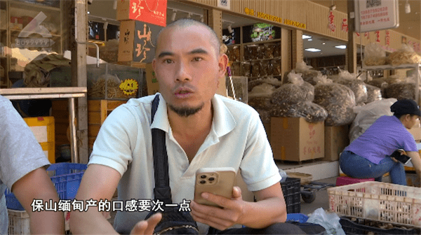 商户:“野生黑牛肝来了一个星期,黑牛肝也分着很多产地,每个产地的口感都不一样。我们本地产的杆要细一点,但是口感要更香一点,缅甸、保山产的口感要差一点。”