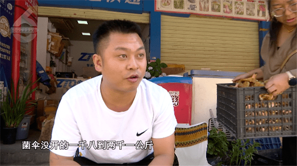 商户:“(鸡枞菌)菌伞没开的1800到2000(元)一公斤,菌伞开了的7、8百一公斤。这两天红葱少,今早有,今天有3两,2400(一公斤)卖了,今天(白天)没见到,很早就卖掉了。”