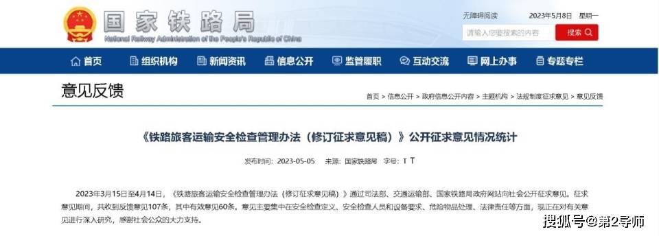 铁路运输安全和旅客生命安全一直是铁路运输工作的重点。记者发现,今年3月,国家铁路局发布了关于《铁路旅客运输安全检查管理办法(修订征求意见稿)》公开征求意见的通知,征求意见时间为3月15日至4月14日,上个月刚结束。