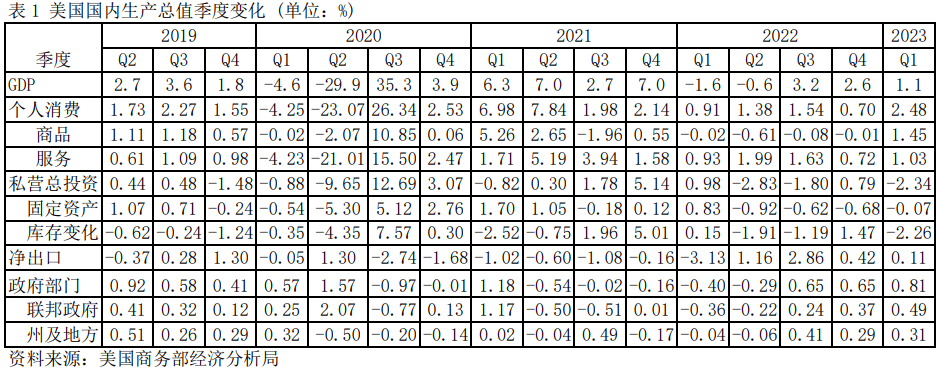从美国商务部数据看,2023年第一季度个人消费支出力保经济不出现负增长,其中商品消费一改前几个季度的颓势,获得了1.45%的增长;私营部门总投资表现低迷,企业在努力减少库存积压;净出口对经济增长贡献减弱,恢复到疫情前的常态;政府部门的消费与投资继续支撑经济增长。在未来经济增长中,个人消费、私营国内总投资、净出口和政府消费与投资哪一组成会发力?这才是问题的关键。