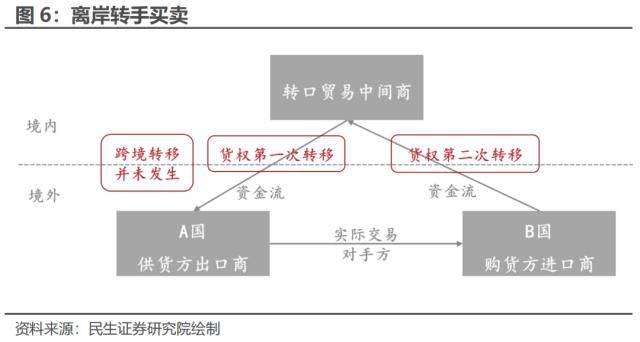 最为典型的例子是离岸转手买卖,其具体模式为:我国居民从非居民处购买货物,境内的转手中间商分别与境外上下游客户签订购销合同,随后向另一非居民转售同一货物,而货物未进出我国关境,直接将货物从出口商运往进口商。