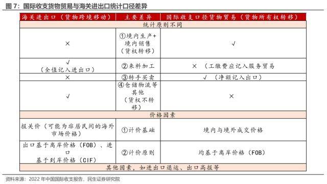 海关统计的商品出口基于离岸价格(FOB)、进口基于到岸价格(CIF),而国际收支统计的货物贸易贷方和借方均基于离岸价格(FOB),剔除了运费的影响。
