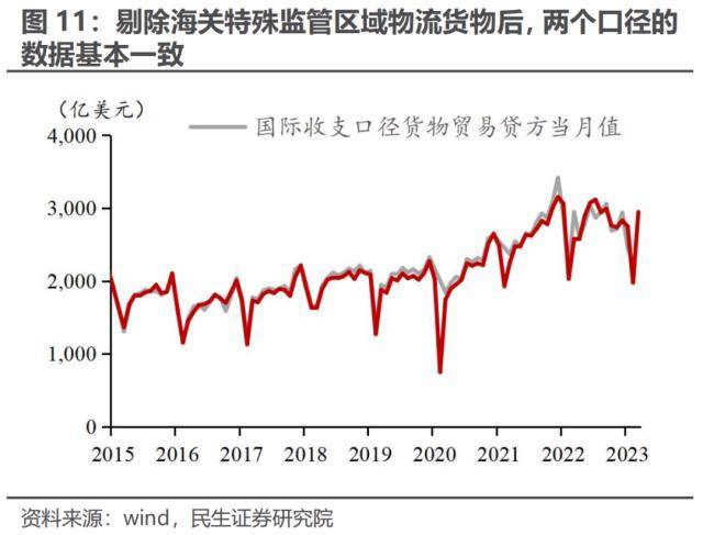 如果我们将海关出口数据中的海关特殊监管区域物流货物所对应的出口剔除,得到的结果基本和国际收支口径货物贸易贷方规模基本一致,两个口径的偏离程度在2020年前后并没有发生显著变化。