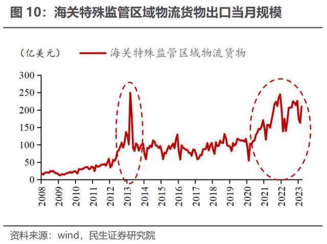 其次,2020年以后两个数据偏离增大的主要原因其实是特殊监管区域内的仓储物流服务规模大幅提升。
