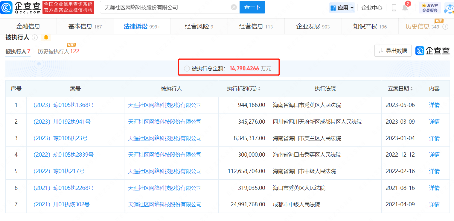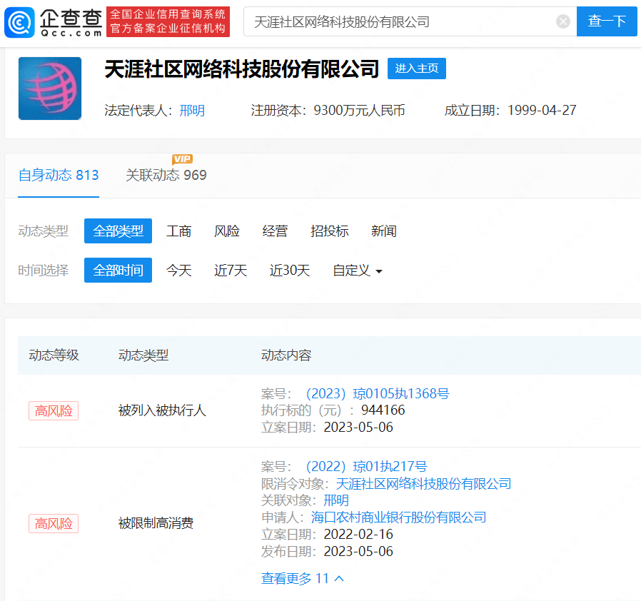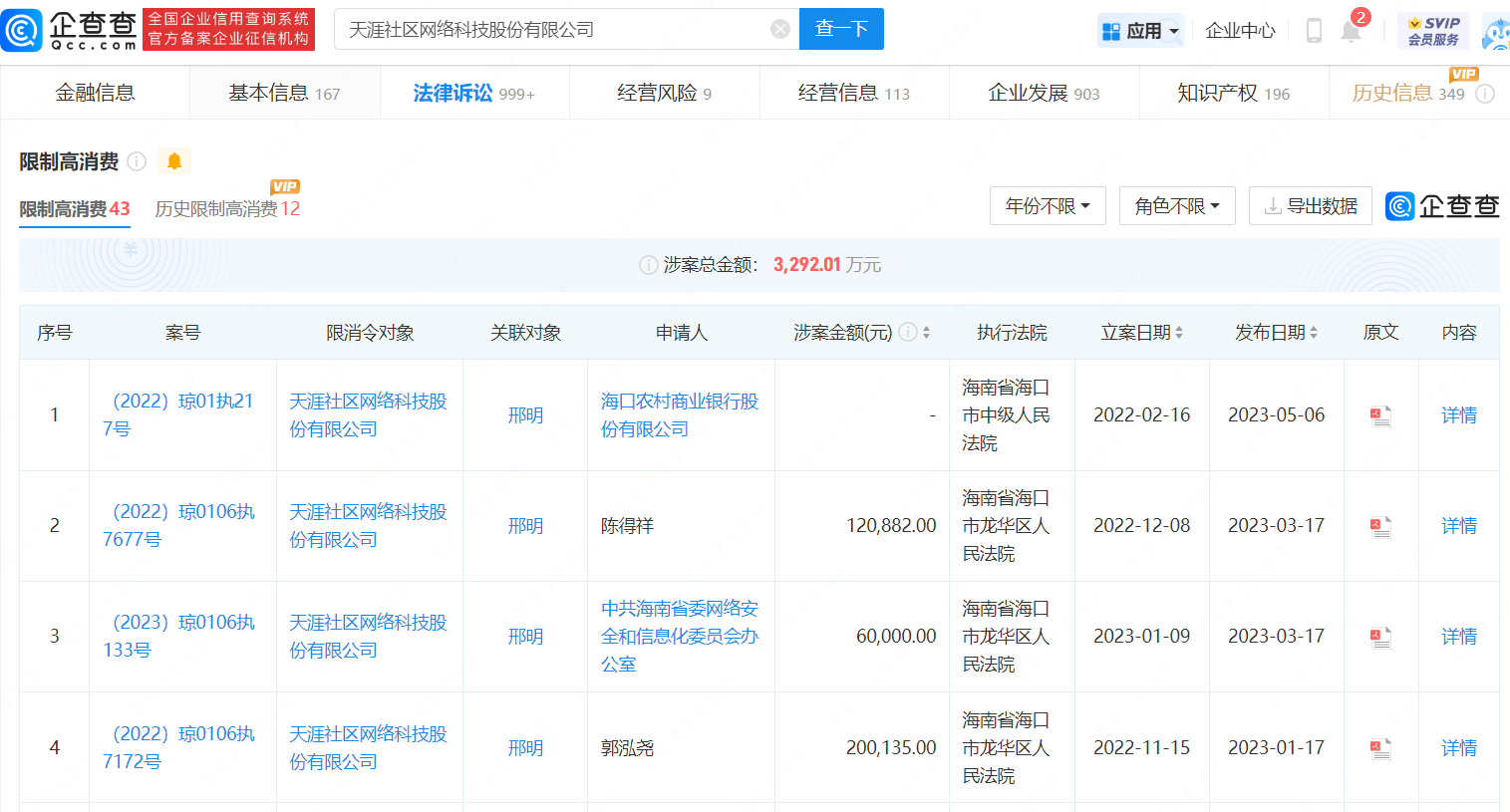 原标题:天涯社区再被限制高消费,累计被执行近1.5亿