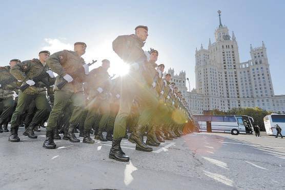 5月7日,在俄罗斯首都莫斯科,士兵列队行进。当日,莫斯科举行卫国战争胜利日阅兵式彩排。 新华社发