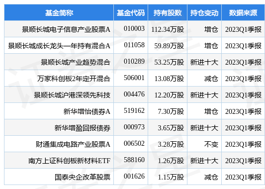 根据2023Q1季报公募基金重仓股数据,重仓该股的公募基金共19家,其中持有数量最多的公募基金为景顺长城电子信息产业股票A。景顺长城电子信息产业股票A目前规模为29.39亿元,最新净值1.1754(5月5日),较上一交易日下跌0.42%,近一年上涨23.7%。该公募基金现任基金经理为杨锐文 张雪薇。杨锐文在任的基金产品包括:景顺长城优选混合,管理时间为2014年10月25日至今,期间收益率为239.02%;景顺长城环保优势股票,管理时间为2016年3月15日至今,期间收益率为210.9%;景顺长城创新成长混合,管理时间为2019年10月17日至今,期间收益率为58.19%;景顺长城成长领航混合,管理时间为2020年5月28日至今,期间收益率为24.58%。