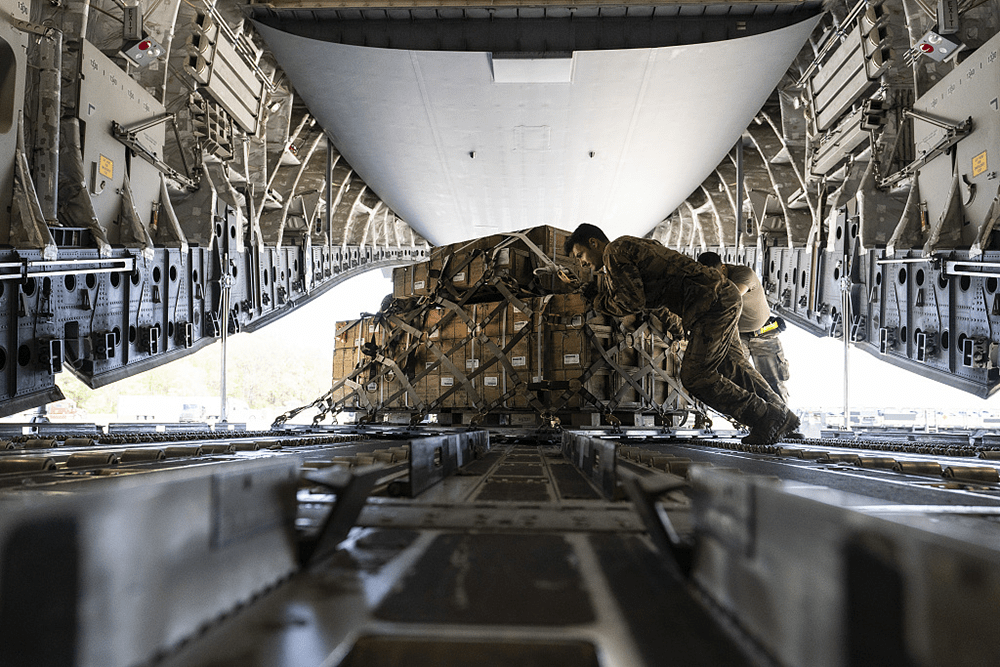 当地时间2022年4月29日,美国多佛空军基地,一托盘的155毫米炮弹引信被装载到一架C-17运输机上,最终运往乌克兰。人民视觉 资料图