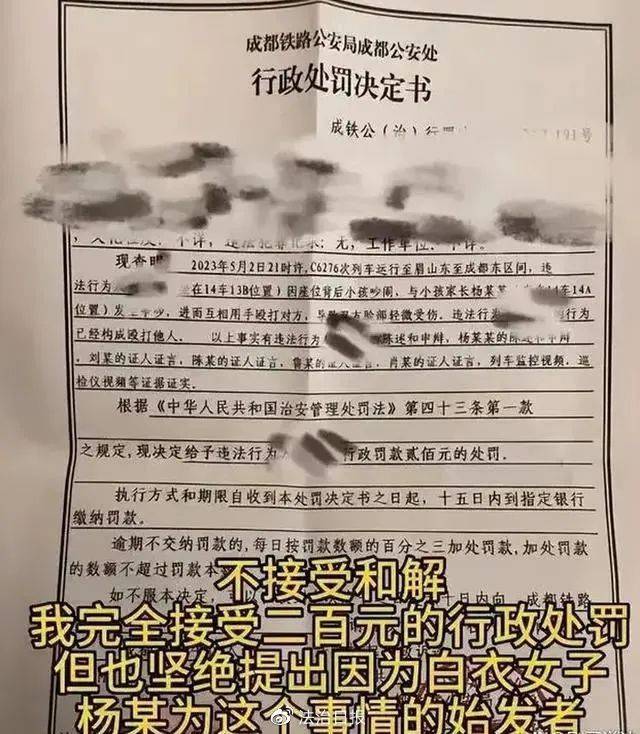 在对该女子作出的《行政处罚决定书》中写道“……发生争吵,进而互相用手殴打对方,导致双方脸部轻微受伤……已经构成殴打他人”,并对其处以200元行政罚款。另据悉,“熊孩子”家长被处以500元行政罚款。