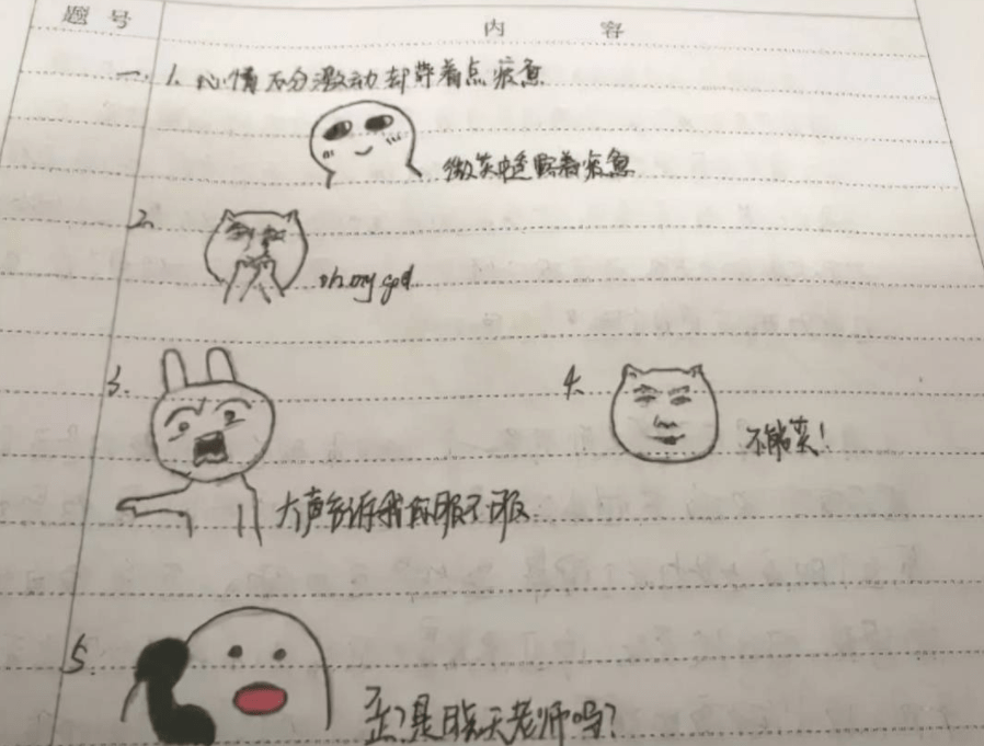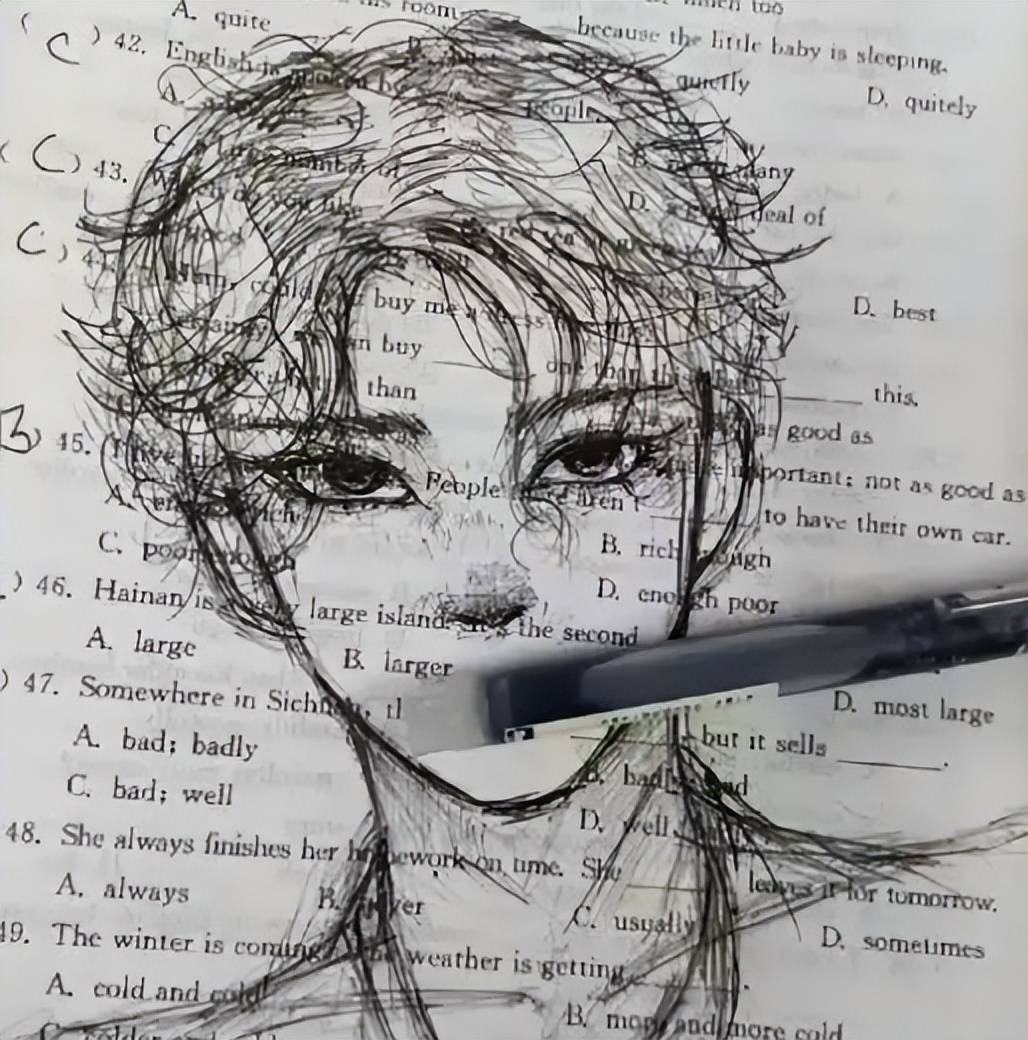 虽然是英语考试,但是乍眼一看,也是被惊讶到了,初三学生画了一个卡通人物,发型别致,浓眉大眼,很是帅气,老师看了爱不释手,英语老师气得说不出话来,一道题都没答,时间全部用来画画了。