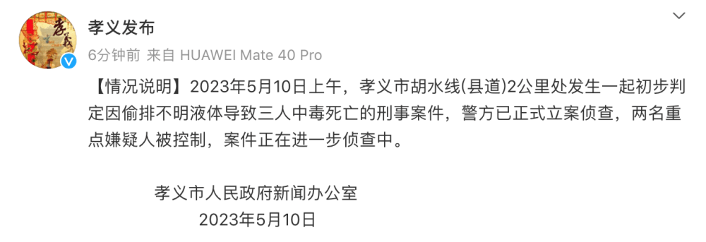 2023年5月10日上午,孝义市胡水线(县道)2公里处发生一起初步判定因偷排不明液体导致三人中毒死亡的刑事案件,警方已正式立案侦查,两名重点嫌疑人被控制,案件正在进一步侦查中。