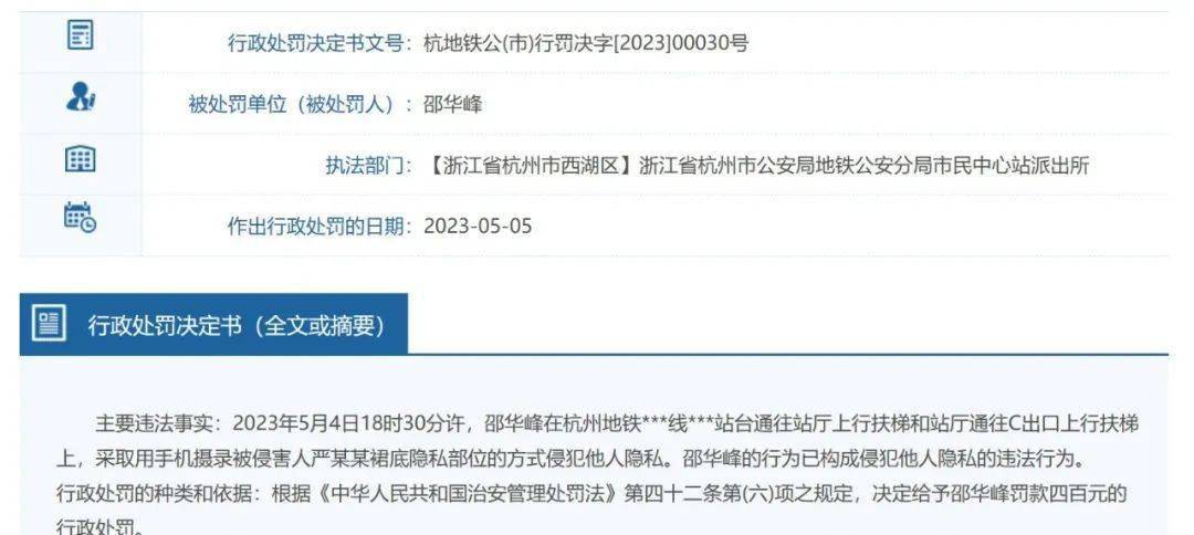 近日,杭州市政府网上公开一起行政处罚公开信息:邵华峰在杭州地铁一站台通往站厅上行扶梯和站厅通往C出口上行扶梯上,采取用手机摄录被侵害人严某某裙底隐私部位的方式侵犯他人隐私。