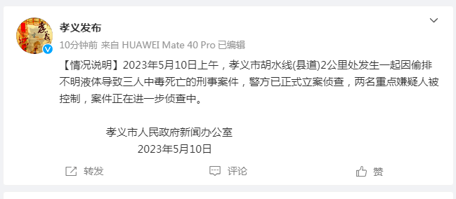 【情况说明】2023年5月10日上午,孝义市胡水线(县道)2公里处发生一起因偷排不明液体导致三人中毒死亡的刑事案件,警方已正式立案侦查,两名重点嫌疑人被控制,案件正在进一步侦查中。