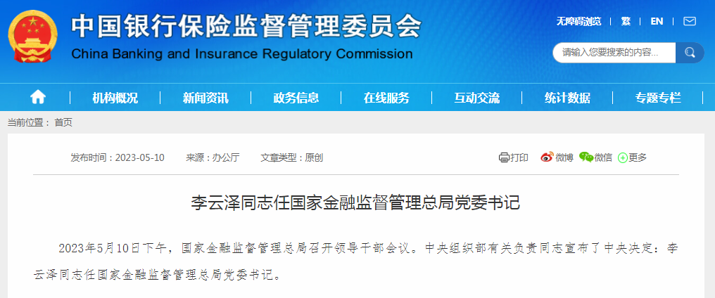 2023年5月10日下午,国家金融监督管理总局召开领导干部会议。中央组织部有关负责同志宣布了中央决定:李云泽同志任国家金融监督管理总局党委书记。