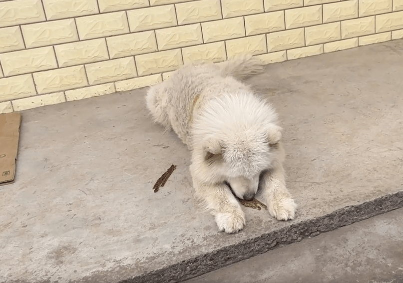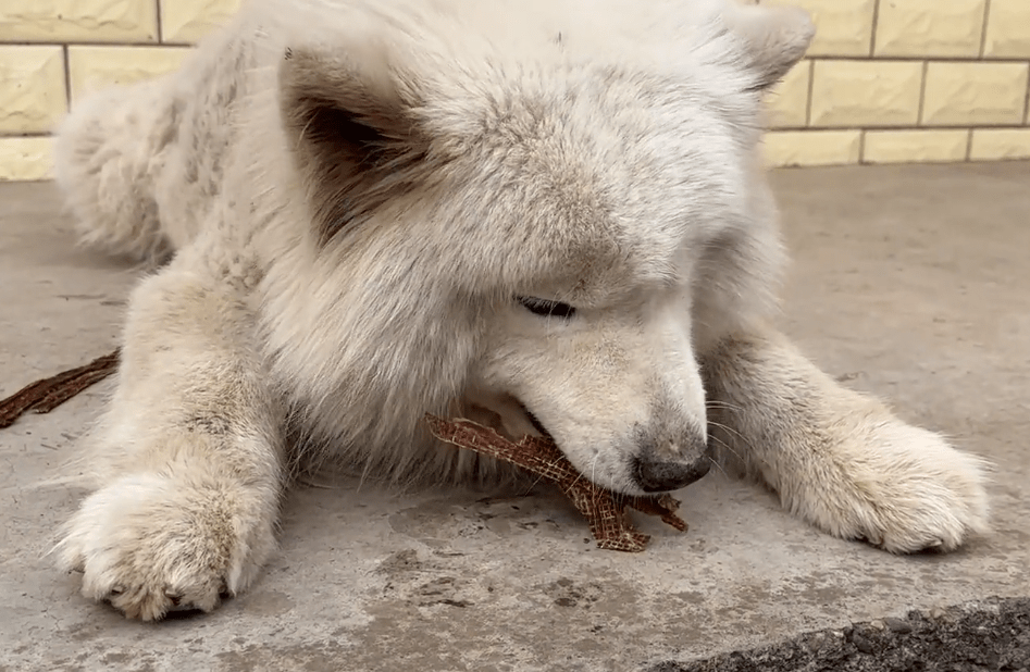 萨摩耶躺在地上,啃着小哥给它的狗狗零食