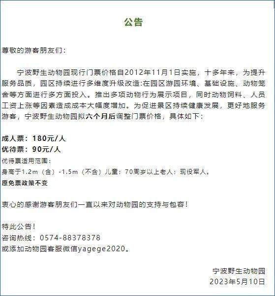 今天,宁波野生动物园官方微信发布公告:为促进景区持续健康发展,更好地服务游客, 拟六个月后调整门票价格,成人票180元/人,优待票90元/人。原免票政策不变。