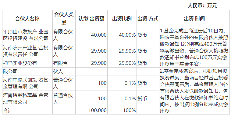 据悉,该基金首期认缴出资额10亿元,其中,神马股份认缴出资2.99亿元;平顶山市发投产业园区投资建设有限公司认缴出资4亿元;河南农开产业基金投资有限责任公司认缴出资2.99亿元,出资比例为29.90%;河南中原联创投资基金管理有限公司认缴出资额100万元,出资比例为0.1%;河南椿鹏私募基金管理有限公司认缴出资额100万元,出资比例为0.1%。