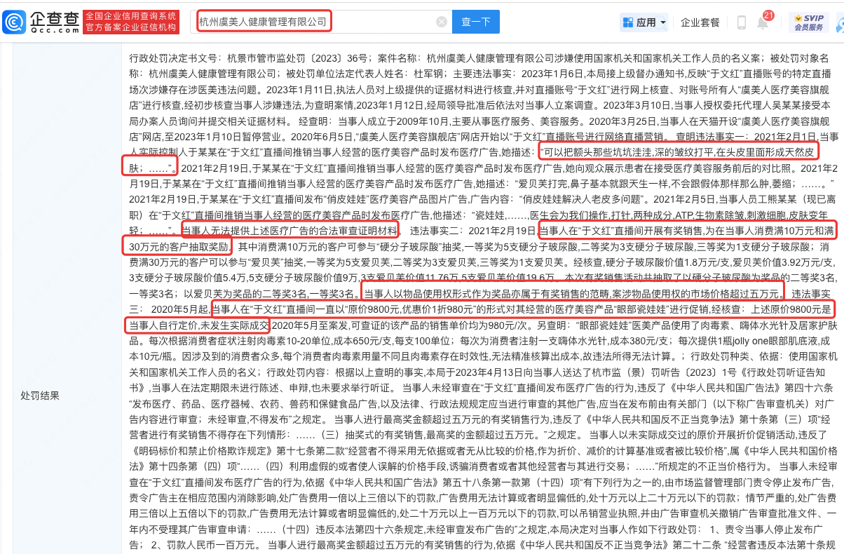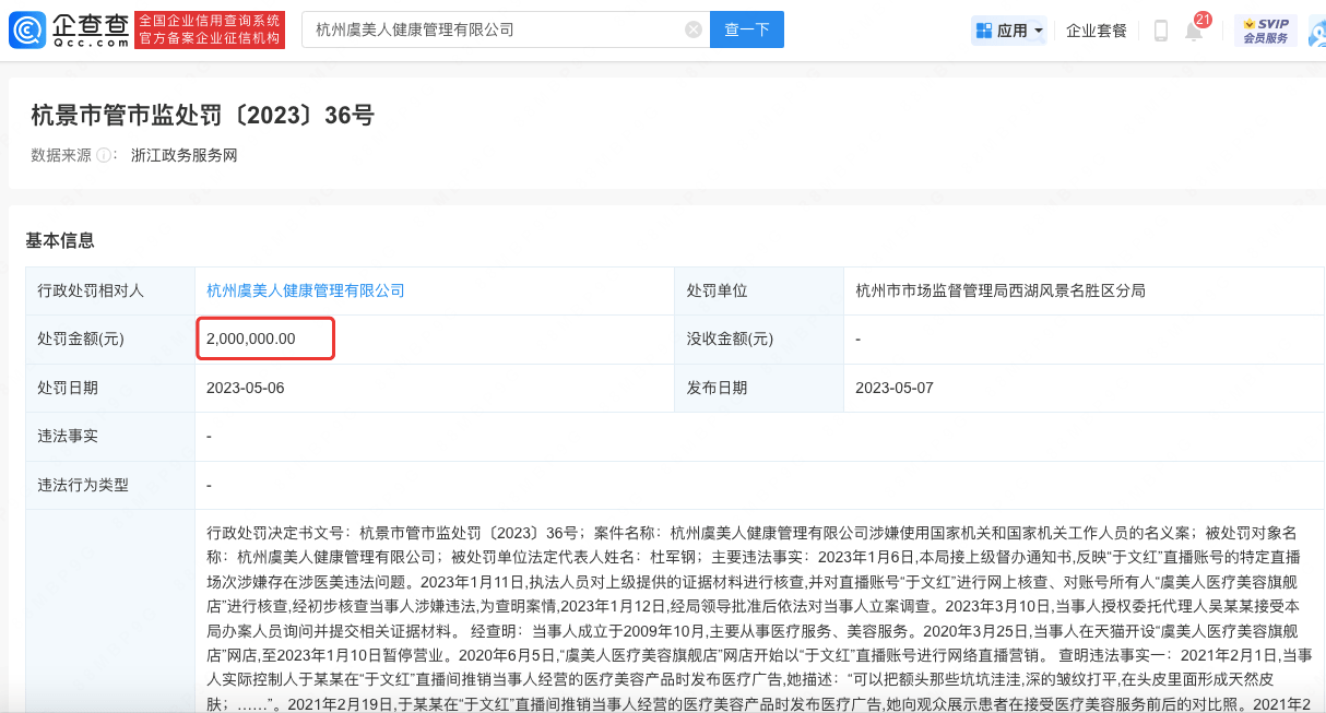 企查查APP显示,近日,杭州虞美人健康管理有限公司因涉嫌存在涉医美违法问题被罚200万元。