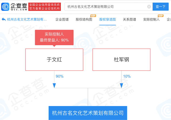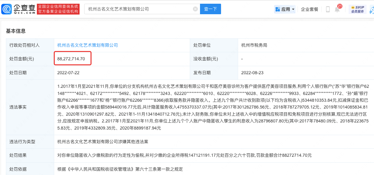 值得关注的是,于文红名下杭州古名文化艺术策划有限公司曾因隐瞒收入超47亿被行政处罚8800万元引发社会关注。