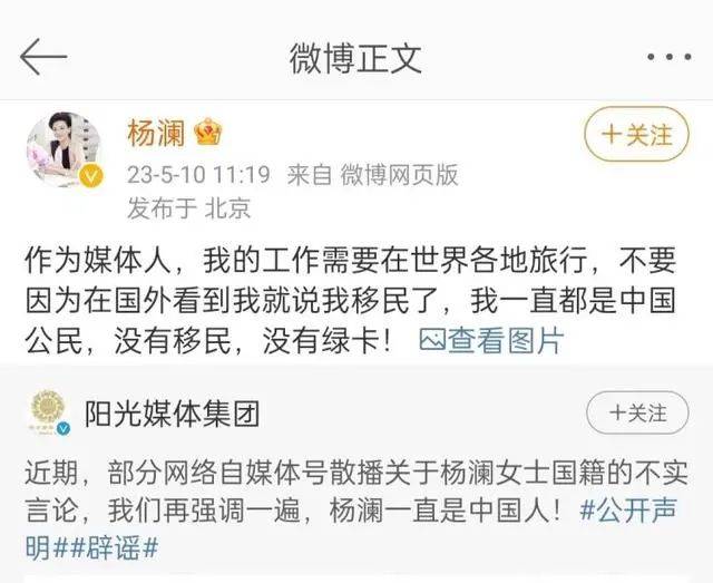 5月10日,阳光媒体集团官方微博发布声明称:近期,部分网络自媒体号散播关于杨澜女士国籍的不实言论,我们再强调一遍,杨澜一直是中国人!
