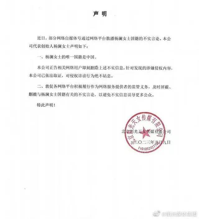 近日,部分网络自媒体号通过网络平台散播杨澜女士国籍的不实言论。本公司代表创始人杨澜女士声明如下: