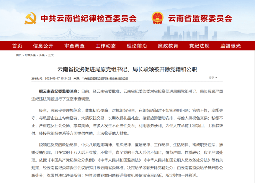 2023年2月17日,云南省纪委监委网站通报消息,云南省投资促进局原党组书记、局长段颖被开除党籍和公职。