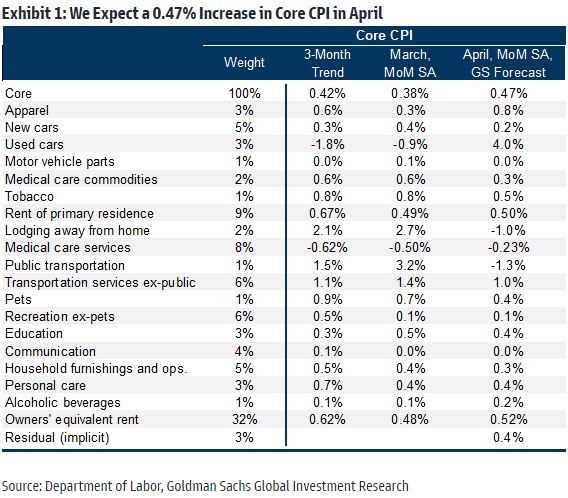 高盛在对CPI前瞻中则预计, 4月份总体CPI将环比上涨0.50%,同比上涨5.09%。 4月份核心CPI将上涨0.47%,同比上涨5.59%。高盛着重提到了这份CPI数据值得关注的三个趋势:
