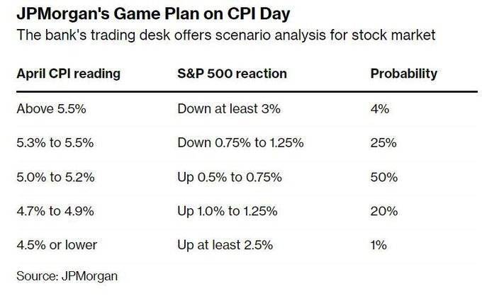 而摩根大通的预测则相对更为看好今晚的市场表现,因为他认为哪怕今晚CPI落在5.0%-5.2%之间(注意这高于了市场预期),也将利好美股。下图为小摩的预测: