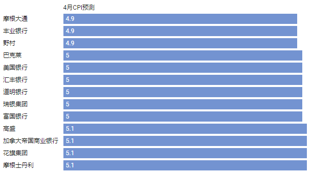 如下图所示,华尔街投行目前的预测大多集中在4.9%-5.1%。其中,摩根大通、丰业银行和野村预计美国CPI有望进一步回落至“4时代”,但更多投行仍认为美国CPI涨幅将维持在5%及以上。