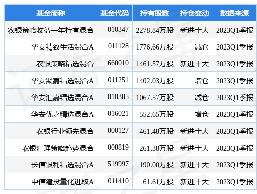 根据2023Q1季报公募基金重仓股数据,重仓该股的公募基金共17家,其中持有数量最多的公募基金为农银策略收益一年持有混合。农银策略收益一年持有混合目前规模为45.88亿元,最新净值0.6578(5月9日),较上一交易日下跌1.51%,近一年下跌8.98%。该公募基金现任基金经理为张峰。张峰在任的基金产品包括:农银行业领先混合,管理时间为2015年9月17日至今,期间收益率为130.28%;农银策略精选混合,管理时间为2015年12月2日至今,期间收益率为85.33%;农银汇理国企改革混合,管理时间为2016年6月3日至今,期间收益率为117.35%;农银汇理策略趋势混合,管理时间为2020年3月13日至今,期间收益率为0.45%。