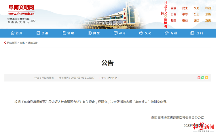 据红星新闻报道,5月9日,记者联系到颁发前述奖项的阜南县文明办,工作人员回应称,徐志辉当时把烈士资料从安徽送到湖南,“确实做了一些好事”,因此获评“阜南好人”特别奖,这种弘扬正能量的事情是值得鼓励的,“至于他后面做了一些违背公序良俗的事情,我们已在5月5日发了通告,经会议研究,已经取消了他的荣誉称号。”