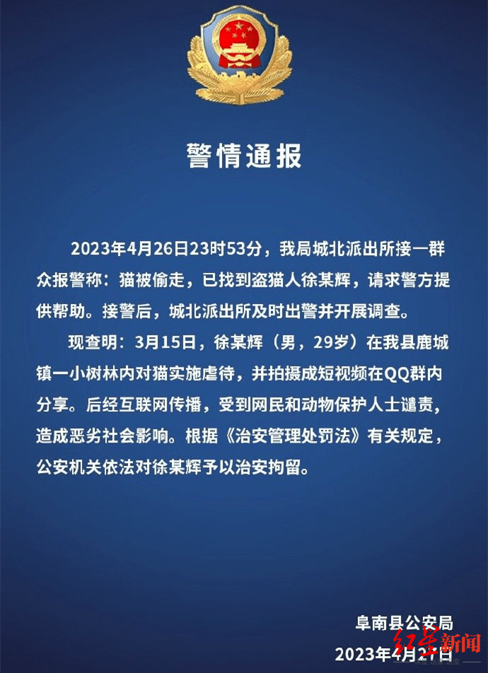 4月27日,阜南县公安局发布警情通报证实,经查明,3月15日,徐某辉(男,29岁)在阜南县鹿城镇一小树林内对猫实施虐待,并拍摄成短视频在QQ群内分享。根据《治安管理处罚法》有关规定,公安机关依法对徐某辉予以治安拘留。