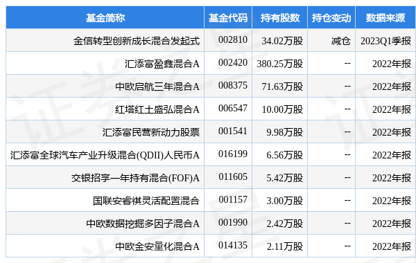 根据2023Q1季报公募基金重仓股数据,重仓该股的公募基金共1家,其中持有数量最多的公募基金为金信转型创新成长混合发起式。金信转型创新成长混合发起式目前规模为2.7亿元,最新净值1.789(5月9日),较上一交易日下跌1.27%,近一年上涨31.35%。该公募基金现任基金经理为杨超。杨超在任的基金产品包括:金信价值精选混合A,管理时间为2021年5月11日至今,期间收益率为20.78%;金信核心竞争力混合,管理时间为2021年7月9日至今,期间收益率为-11.86%;金信民旺债券A,管理时间为2022年1月5日至今,期间收益率为-5.42%;