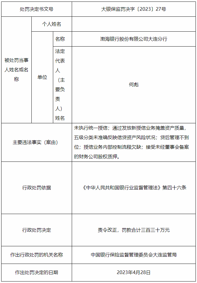 大银保监罚决字〔2023〕27号显示,渤海银行大连分行存在五项主要违法事实:一是未执行统一授信;二是通过发放新授信业务掩盖资产质量,五级分类未准确反映信贷资产风险状况;三是贷后管理不到位;四是授信业务内部控制流程欠缺;五是接受未经董事会备案的财务公司股权质押。