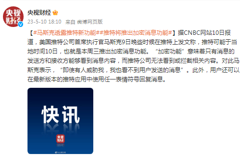 据CNBC网站10日报道,美国推特公司首席执行官马斯克9日晚些时候在推特上发文称,推特可能于当地时间10日,也就是本周三推出加密消息功能。“加密功能”意味着只有消息的发送方和接收方能够看到消息内容,而推特公司无法看到或拦截相关内容。对此马斯克表示,“即使有人威胁我,我也看不到用户发送的消息”。此外,用户还可以在最新版本的推特应用中使用任一表情符号回复消息。