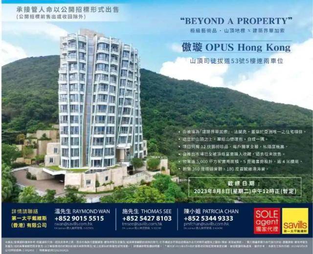 据港媒消息,近日,祥祺集团主席陈红天旗下位于港岛东半山的豪宅傲璇(OPUS)被以公开招标的形式出售。