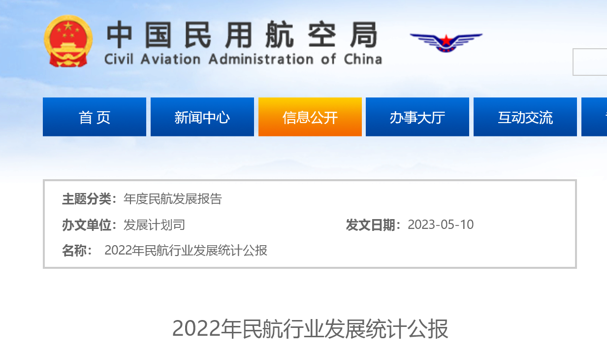 5月10日,中国民航局官网发布《2022年民航行业发展统计公报》。