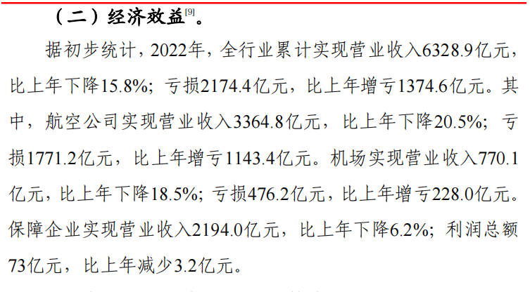 其中,航空公司实现营业收入3364.8亿元,比上年下降20.5%;亏损1771.2亿元,比上年增亏1143.4亿元。机场实现营业收入770.1亿元,比上年下降18.5%;亏损476.2亿元,比上年增亏228.0亿元。保障企业实现营业收入2194.0亿元,比上年下降6.2%;利润总额73亿元,比上年减少3.2亿元。