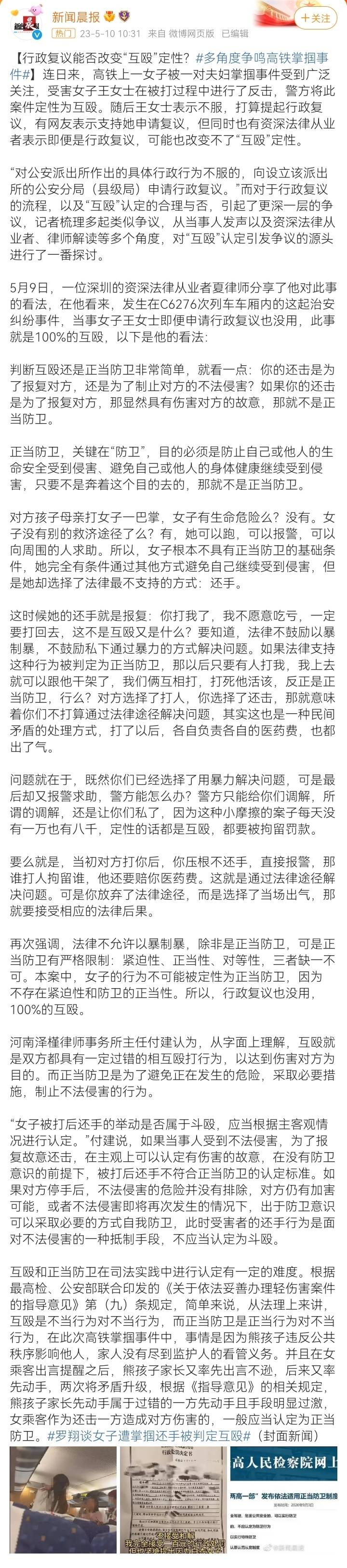 #司法部官微就高铁掌掴事件发声#“在司法实践中应当明确,适度反击不属于互殴,不应给予反击者处罚。”司法部官微以专家访谈的方式参与了5月2日发生在成都的高铁掌掴事件,文中旗帜鲜明地这样认定。