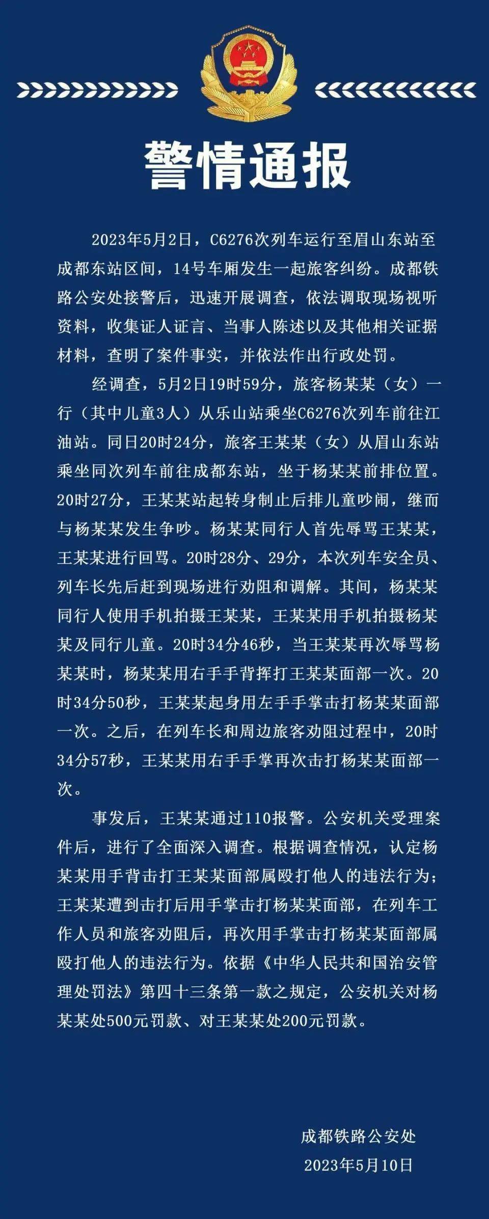 5月10日,成都铁路公安处通报“高铁掌掴事件”。5月2日,C6276次列车运行至眉山东站至成都东站区间,14号车厢发生一起旅客纠纷。根据调查情况,认定杨某某用手背击打王某某面部属殴打他人的违法行为;王某某遭到击打后用手掌击打杨某某面部,在列车工作人员和旅客劝阻后,再次用手掌击打杨某某面部属殴打他人的违法行为。