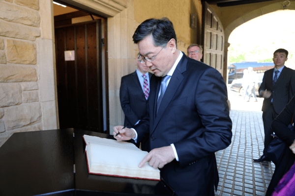 秦刚并在签名簿上留言:维护战后国际秩序、促进世界和平繁荣、实现中国国家统一。
