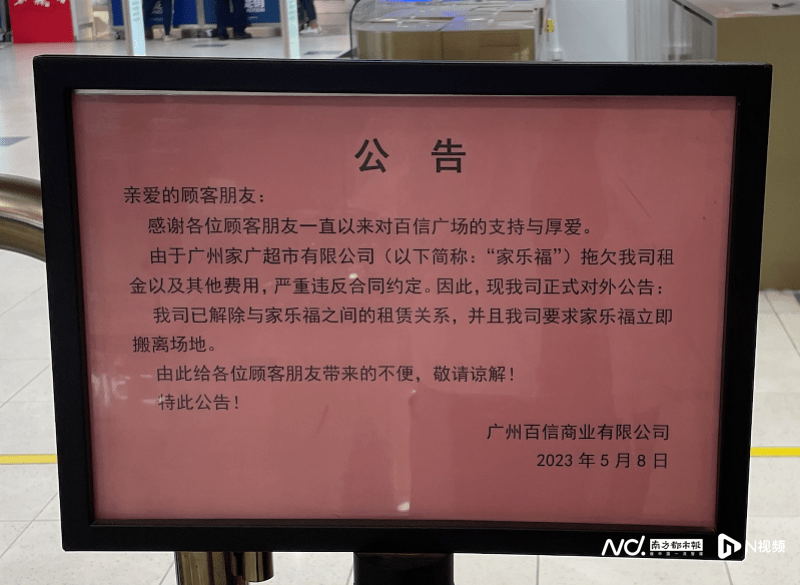 因拖欠商场租金及其他费用,家乐福广州百信广场店(又称“新市店”)被物业要求立即搬离场地。