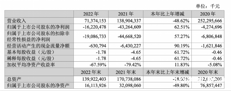 作为家乐福的控股方,苏宁同样连年亏损,并且流动性承压。财报显示,2022年,苏宁易购实现营业收入713.74亿元,同比下跌48.62%;净亏损为162.20亿元,亏损缩减了62.51%。2022年,苏宁的流动负债为1041.66亿元,流动比率为0.57,速动比率为0.46,短期债务存在一定的偿付压力。