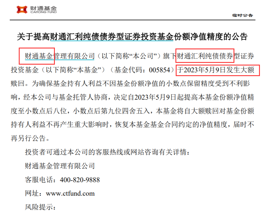 5月10日财通基金公告称,财通汇利纯债基金于5月9日发生大额赎回。为确保基金持有人利益不因基金份额净值的小数点保留精度受到不利影响,5月9日起提高份额净值精度。