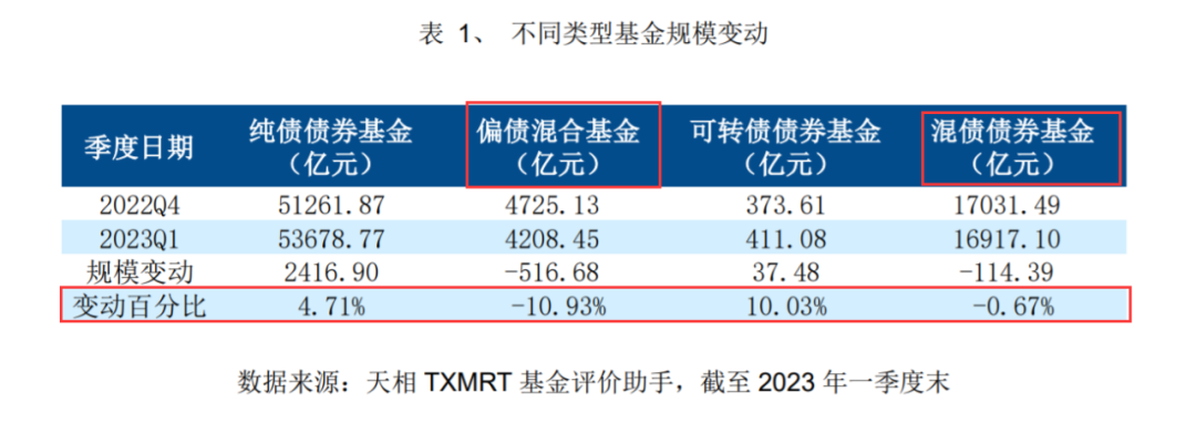 天相投顾在对主动偏债基金一季报的统计报告中指出,在经历了2022年四季度固收类公募产品赎回潮以及市场规模缩减后,今年一季度固收类公募基金规模得到了小幅上升。但各类产品中分化明显,如纯债基金从5.13万亿元上升到5.37万亿元,增幅为4.71%;混债基金规模小幅下降0.67%;偏债混合基金规模缩水逾500亿元,降幅超10%;可转债基金一季度规模增长37.48亿元,增幅超10%。