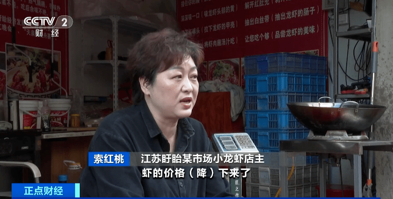 江苏盱眙某市场小龙虾店主 索红桃:目前,虾的价格降下来了,像现在三四五钱的虾13元、14元一斤,七八九钱的每斤35元。