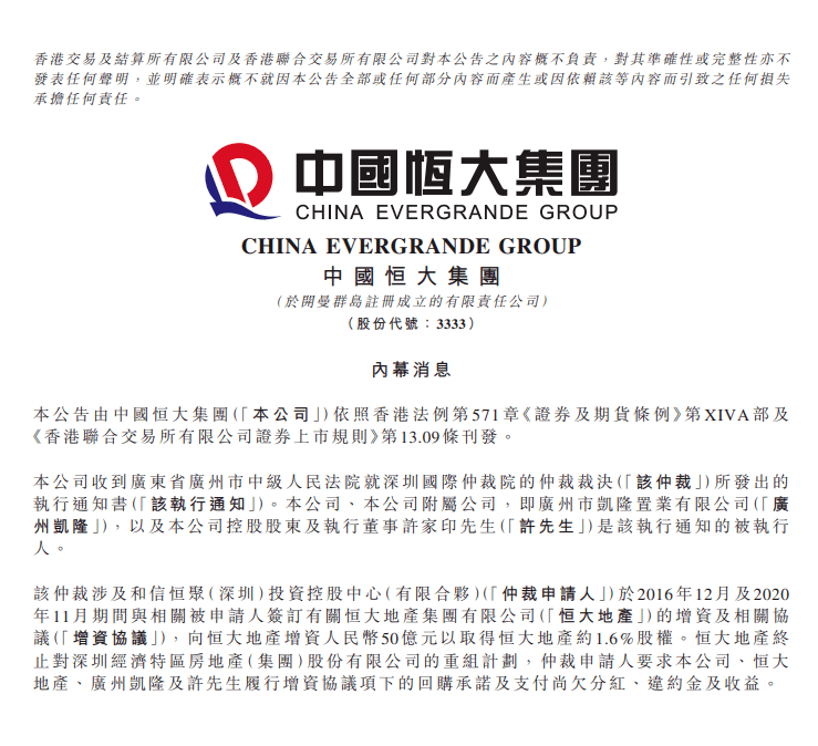 中国恒大12日晚间发布公告称,公司收到广东省广州市中级人民法院就深圳国际仲裁院的仲裁裁决所发出的执行通知书。公告称,公司、附属公司,即广州市凯隆置业有限公司以及公司控股股东及执行董事许家印是该执行通知的被执行人。