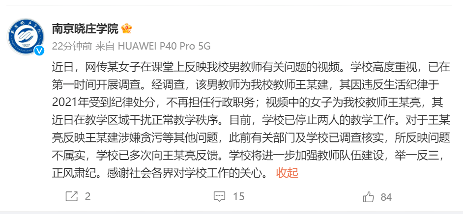通报称,近日,网络流传某女子在课堂上反映我校男教师有关问题的视频。学校高度重视,已在第一时间开展调查。经调查,该男教师为我校教师王某建,其因违反生活纪律于2021年受到纪律处分,不再担任行政职务;视频中的女子为我校教师王某亮,其近日在教学区域干扰正常教学秩序。