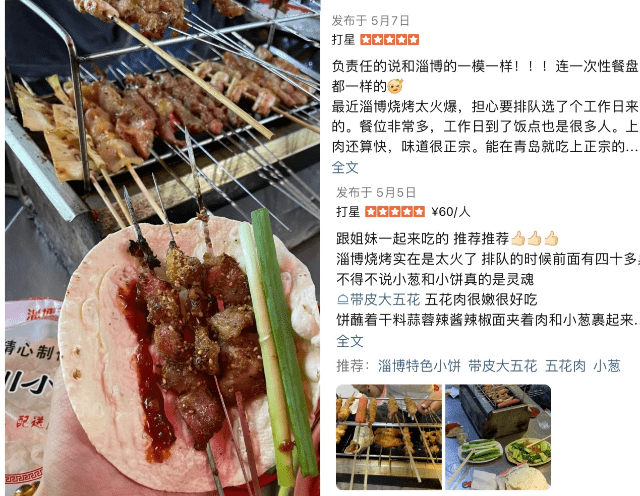 ▲各地消费者通过线上平台“就近”寻找淄博烧烤店体验美食。(图源:大众点评用户)