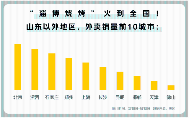 美团数据显示,自3月走红以来,淄博烧烤的到店餐饮商户数环比增长超22倍,外卖商户数增长超65倍,相关菜品的销量环比增长20倍。截至5月8日,淄博烧烤的山东省外外卖商户数占比增至三成,销量前10城市一半在省外,外卖销量前10的城市(不含山东地区)依次为:北京、漯河、石家庄、郑州、上海、长沙、昆明、邯郸、天津、佛山。